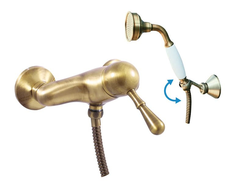 Páková nástěnná SPRCHOVÁ BATERIE se sprchovým setem. V provedení stará mosaz. Rozteč baterie 150 mm.