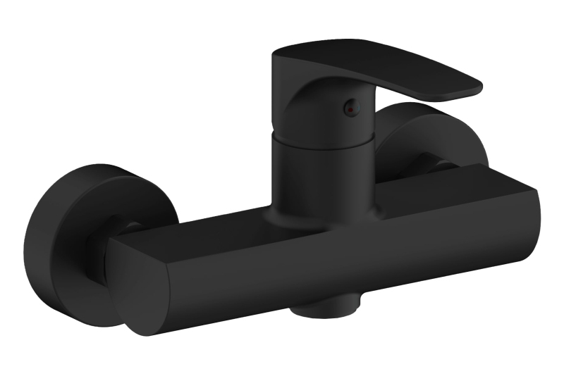 Páková nástěnná sprchová baterie bez sprchového setu v barvě černá matná. Rozteč baterie 150 mm. S matným povrchem