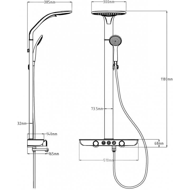 Špecifikácia produktu: Materiál stĺpika: Hliník Povrchová úprava stĺpika: Čierna Výška: 1180 mm Šírka stĺpika: 73,5 mm Vzdialenosť od steny: 385 mm Materiál sprchovej hlavice: ABS Počet funkcií: 2 Povrchová úprava sprchovej hlavice: Čierna Materiál rukoväte: ABS Povrchová úprava Povrchová úprava hadice: Čierna Dĺžka hadice: 150 cm Mosadzné koncovky Hladký povrch uľahčuje údržbu Otočné koncovky zabraňujú krúteniu Flexibilný materiál odolný voči naťahovaniu a ohýbaniu Materiál batérie: Mosadzné telo Povrchová úprava batérie: Čierna Počet funkcií: 3 Výpusť umiestnená v spodnej časti batérie