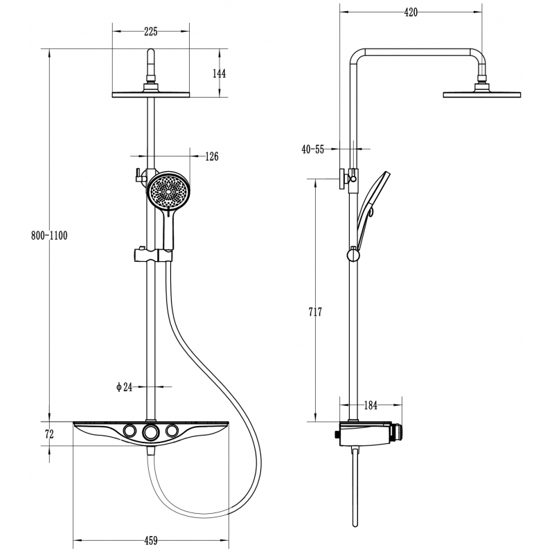 Špecifikácia produktu: Materiál stĺpika: Nerezová oceľ Povrchová úprava stĺpika: Chróm Výška: 800-1100 mm Šírka stĺpika: ø24 mm Vzdialenosť od steny: 420 mm Posuvný držiak ručnej sprchy Materiál sprchovej hlavice: ABS Povrchová úprava sprchovej hlavice: Chróm / Biela Veľkosť ABS Povrchová úprava ručnej sprchy: Chróm / Biela Počet funkcií: 3 Materiál hadice: PVC Povrchová úprava hadice: Chróm Dĺžka hadice: 150 cm Mosadzné koncovky Hladký povrch uľahčuje údržbu Otočné koncovky zabraňujú krúteniu Flexibilný materiál odolný voči naťahovaniu a ohýbaniu Chróm/Biela Počet funkcií: 2 Praktická sklenená polička na kozmetiku