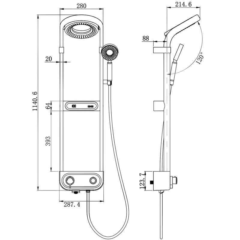 Špecifikácia produktu: Materiál stĺpika: Hliník Povrchová úprava stĺpika: Čierna Výška: 1140 mm Šírka stĺpika: 280 mm Materiál sprchovej hlavice Rain: ABS Povrchová úprava sprchovej hlavice Rain: Čierna Počet funkcií: 2 Sprchová hlavica Rain otočná o 360 ° Materiál rukoväte: 3 Materiál hadice: PVC Povrchová úprava hadice: Čierna Dĺžka hadice: 150 cm Mosadzné koncovky Hladký povrch uľahčuje údržbu Otočné koncovky zabraňujú krúteniu Flexibilný materiál odolný voči naťahovaniu a ohýbaniu Materiál batérie: Mosadzné telo Povrchová úprava batérie: Čierna Počet funkcií: 3 polička na kozmetiku Bez možnosti regulácie tlaku vody, zapínania a vypínania prúdu pomocou funkcie ON-OFF