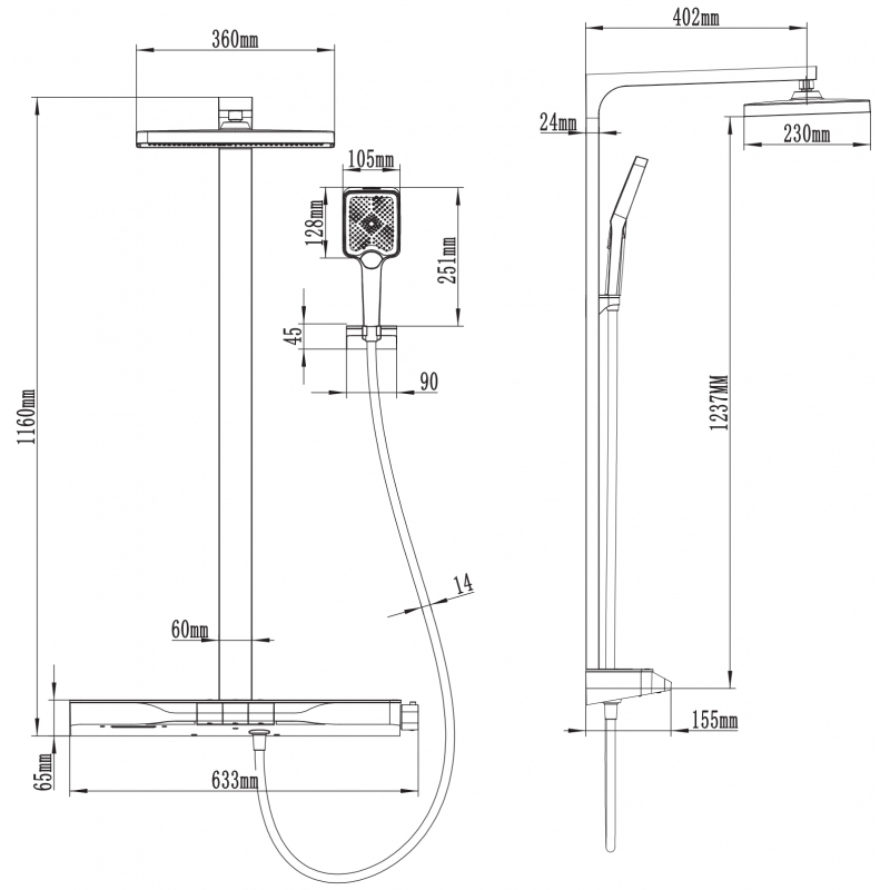 Špecifikácia produktu: Materiál stĺpika: Hliník Povrchová úprava stĺpika: Čierna Výška: 1160 mm Šírka stĺpika: 60 mm Vzdialenosť od steny: 402 mm Materiál sprchovej hlavice: ABS Povrchová úprava sprchovej hlavice: Čierna Veľkosť sprchovej hlavice: 230 x 360 mm Materiál ručná ruka: Čierna Počet funkcií: 3 Materiál hadice: PVC Povrchová úprava hadice: Čierna Dĺžka hadice: 150 cm Mosadzné koncovky Hladký povrch uľahčuje údržbu Otočné koncovky zabraňujú krúteniu Flexibilný materiál odolný proti naťahovaniu a ohýbaniu Materiál batérie: Mosadzné telo Povrchová úprava batérie: Čierna sklenená polička na kozmetiku Tlak vody nie je možné regulovať, prúd sa zapína a vypína funkciou ON-OFF