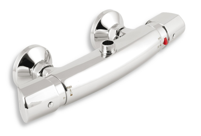 Termostatická nástěnná sprchová baterie s horním vývodem. V chromovém provedení. Rozteč baterie 150 mm.