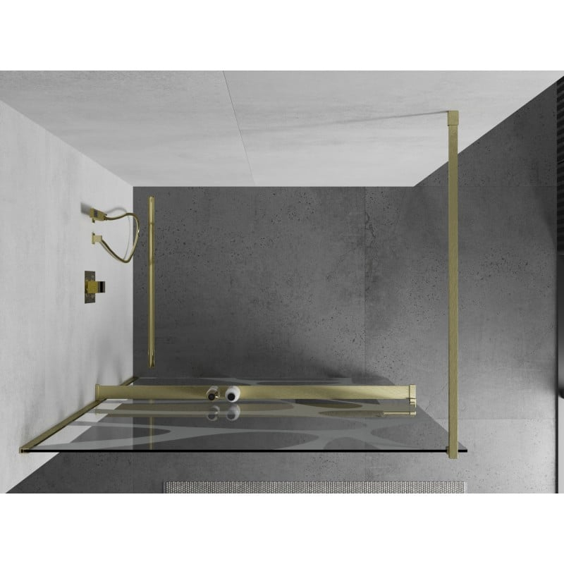 Špecifikácia produktu: Šírka: 90 cm Výška: 200 cm Montáž: Univerzálna, pravá alebo ľavá Farba skla: Biela vlna Povrchová úprava: Kartáčované zlato Typ skla: Tvrdené Hrúbka skla: 8 mm Profil: Hliník Konzola: Nerezová oceľ Max. dĺžka konzoly: 150 cm Materiál police: Hliník Šírka: 12,9 cm Výška: 3,2 cm Max. dĺžka police: 140 cm Možnosť skrátenia konzoly a police Povlak na jednoduché čistenie Vyrovnanie nerovností stien Možnosť montáže na sprchovú vaničku alebo obklady