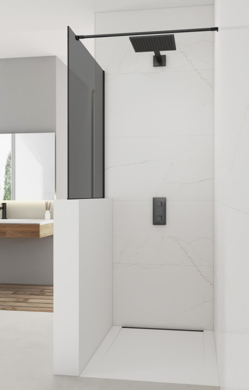 Sprchová zástena walk-in s profilmi a zavetrovaním v čiernej farbe má dekor dymového efektu a má dekor dymového efektu. Produkt je opatrený povrchovou úpravou Easy Clean, ktorá uľahčuje čistenie a minimalizuje usadzovanie vodného kameňa. Nedá sa otvoriť - pevný systém. Určenie - ľavá aj pravá orientácia.