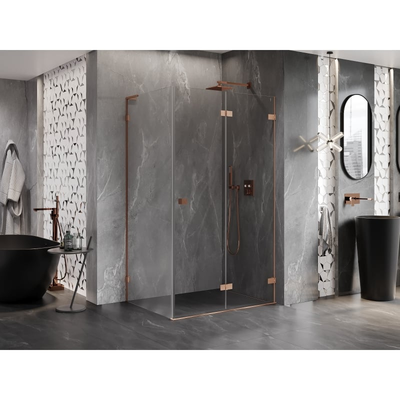 Špecifikácia produktu: Rozmer: 100x70 cm (pravé dvere 100 cm, stena 70 cm) Výška: 200 cm Strana montáže: Pravá Vchod: Skladacie dvere Farba skla: Priehľadná Povrchová úprava: Kartáčovaná meď Profil: Hliník Uhlový stabilizátor L: Nerezová oceľ Typ skla: Tvrd mm Obliečka na jednoduché čistenie Možnosť nastavenia šírky Dva montážne systémy: - s profilom, ktorý umožňuje vyrovnanie nerovností stien - bez profilu v prípade dokonale rovných stien Možnosť montáže na sprchovú vaničku alebo obklady Mosadzné svorky a pánty v jednej rovine so sklenenou tabuľou Magnetický prúžok a elastomérové tesnenie pre odvod vody Hliníkový