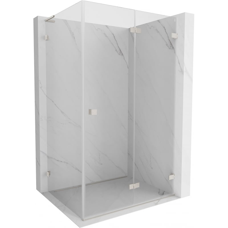 Špecifikácia produktu: Rozmer: 100x90 cm (pravé dvere 100 cm, stena 90 cm) Výška: 200 cm Strana montáže: Pravá Vchod: Skladacie dvere Farba skla: Priehľadná Povrchová úprava: Kartáčovaný nikel Profil: Hliník Uhlový stabilizátor L: Nerezová oceľ Typ skla: 8 mm Obliečka na jednoduché čistenie Možnosť nastavenia šírky Dva montážne systémy: - s profilom, ktorý umožňuje vyrovnanie nerovností steny - bez profilu v prípade dokonale rovných stien Možnosť montáže na sprchovú vaničku alebo obklady Mosadzné svorky a pánty v jednej rovine so sklenenou tabuľou Magnetický prúžok a elastomérové tesnenie pre odvod vody