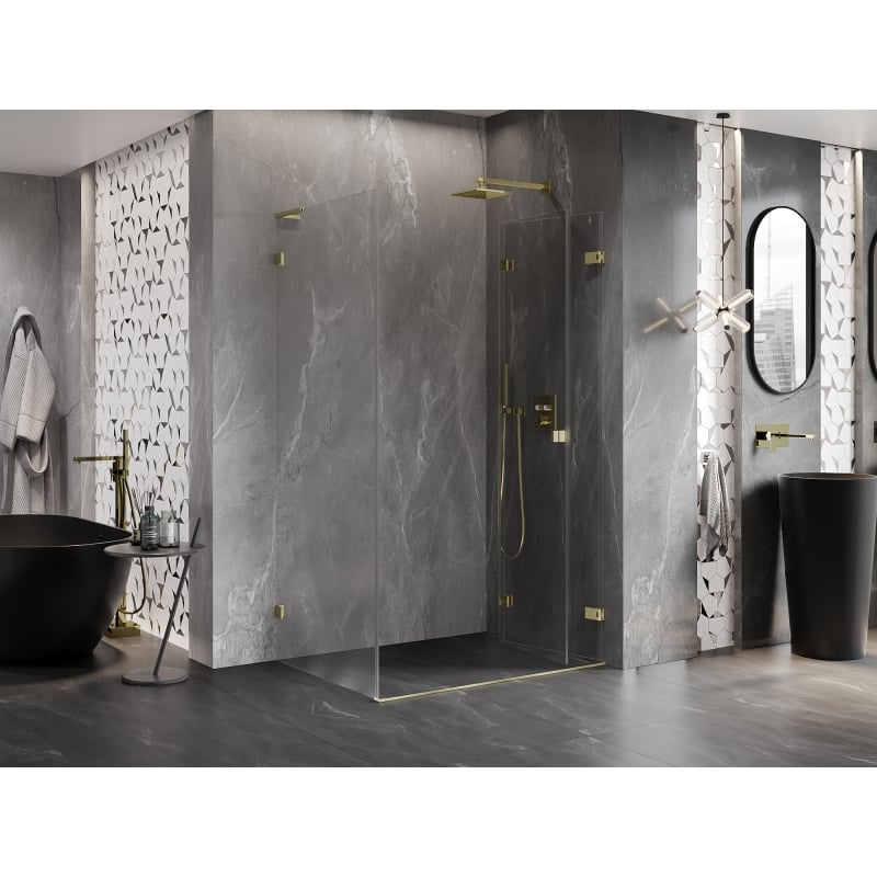 Špecifikácia produktu: Rozmer: 85x70 cm (pravé dvere 85 cm, stena 70 cm) Výška: 200 cm Strana montáže: Pravá Vchod: Skladacie dvere Farba skla: Priehľadná Povrchová úprava: Kartáčované zlato Profil: Hliník Uhlový stabilizátor L: Nerezová oceľ Typ skla: Tvrdené Obliečka na jednoduché čistenie Možnosť nastavenia šírky Dva montážne systémy: - s profilom, ktorý umožňuje vyrovnanie nerovností stien - bez profilu v prípade dokonale rovných stien Možnosť montáže na sprchovú vaničku alebo obklady Mosadzné svorky a pánty v jednej rovine so sklenenou tabuľou Magnetický prúžok a elastomérové tesnenie pre odvod vody Hliníkový práh