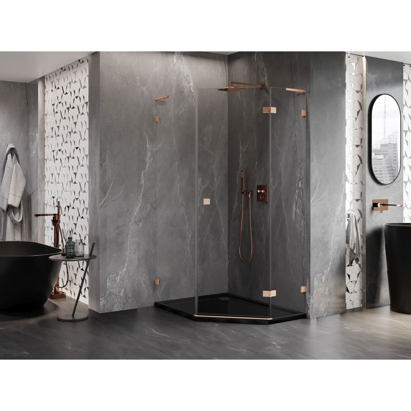 Sprchovací kút Mexen Lunar L päťuholníkový, pravý, výklopný, 80 x 90 cm, priehľadný, kartáčovaná meď - 831L-080P-090L-65-00-P