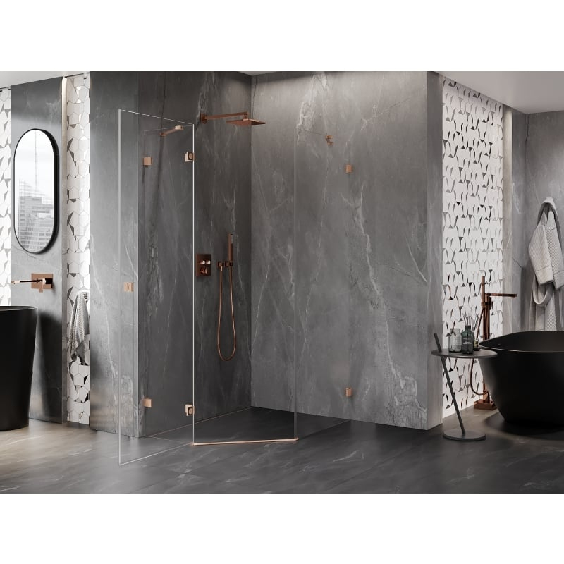 Špecifikácia produktu: Rozmer: 80x90 cm (ľavé dvere 80 cm, stena 90 cm) Výška: 200 cm Strana montáže: Ľavá Vchod: Dvere s otočnými pántami Farba skla: Priehľadná Povrchová úprava: Kartáčovaná meď Profil: Hliník Typ skla: Tvrdené Hrúbka skla: montážne systémy: - s profilom, ktorý umožňuje vyrovnanie nerovností stien - bez profilu pre dokonale rovné steny Možnosť montáže na sprchovú vaničku alebo obklady Mechanizmus na zdvíhanie a spúšťanie dverí Mosadzné svorky a pánty v jednej rovine so sklenenou tabuľou Magnetický prúžok a elastomérové tesnenie pre odvod vody Hliníkový prah