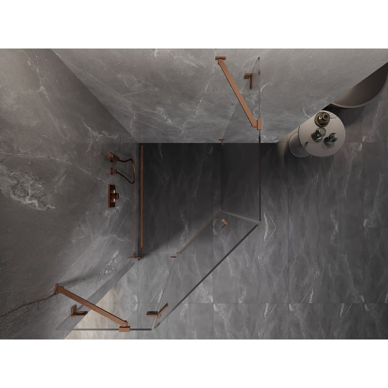 Sprchovací kút Mexen Lunar päťuholníkový, ľavý, výklopný, 90 x 100 cm, priehľadný, kartáčovaná meď - 831-090L-100P-65-00-L