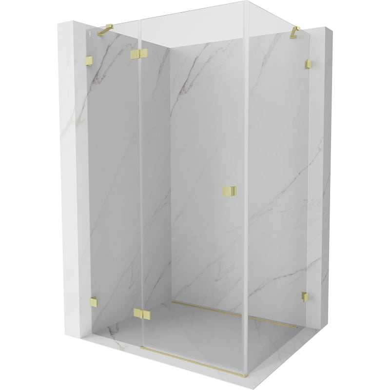 Špecifikácia produktu: Rozmer: 75x80 cm (ľavé dvere 75 cm, stena 80 cm) Výška: 200 cm Strana montáže: Ľavá Vchod: Dvere s otočnými pántami Farba skla: Priehľadná Povrchová úprava: Kartáčované zlato Profil: Hliník Typ skla: Tvrdené Hrúbka skla: 8 montážne systémy: - s profilom, ktorý umožňuje vyrovnanie nerovností stien - bez profilu pre dokonale rovné steny Možnosť montáže na sprchovú vaničku alebo obklady Mechanizmus na zdvíhanie a spúšťanie dverí Mosadzné svorky a pánty v jednej rovine so sklenenou tabuľou Magnetický prúžok a elastomérové tesnenie pre odvod vody Hliníkový prah