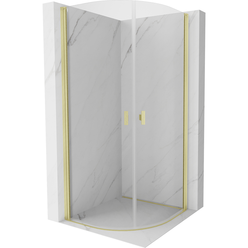 Špecifikácia produktu: Rozmer: 80x80 cm Výška: 200 cm Polomer zakrivenia R55 Strana montáže: Univerzálny Vchod: Dvere s výklopnými krídlami Farba skla: Priehľadná Povrchová úprava: Kartáčované zlato Profil: Hliník Typ skla: Tvrdené Hrúbka skla: 6 mm sprchovaciu vaničku alebo dlaždice Mechanizmus zdvíhania a spúšťania dverí Magnetický prúžok a elastomérové tesnenie pre odtok vody Hliníkový prah tesnenia dverí
