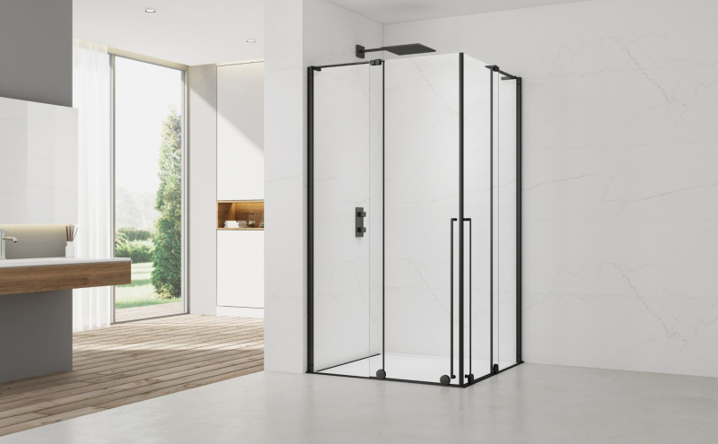 Sprchovací kút s dverami v čiernej farbe, výplň je z číreho skla bez dekoru. Produkt je opatrený povrchovou úpravou Easy Clean, ktorá uľahčuje čistenie a minimalizuje usadzovanie vodného kameňa. Posuvný systém otvárania. Určenie - ľavá aj pravá orientácia.