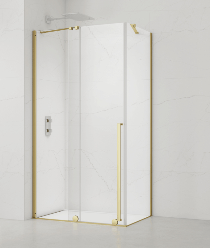 Sprchovací kút vrátane bočnej zásteny v zlatom lesklom prevedení, výplň je z číreho skla bez dekoru. Produkt je opatrený povrchovou úpravou Easy Clean, ktorá uľahčuje čistenie a minimalizuje usadzovanie vodného kameňa. Posuvný systém otvárania. Určenie - ľavá aj pravá orientácia.