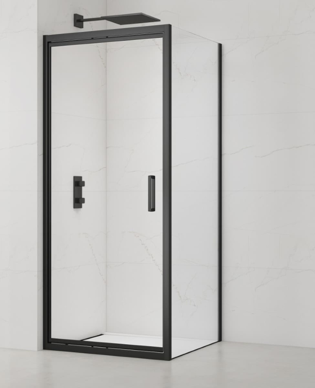Sprchovací kút vrátane bočnej zásteny v čiernej farbe, výplň je z číreho skla bez dekoru. Produkt je opatrený povrchovou úpravou Easy Clean, ktorá uľahčuje čistenie a minimalizuje usadzovanie vodného kameňa. Zalamovací systém otvárania. Určenie - ľavá aj pravá orientácia.