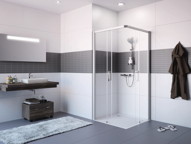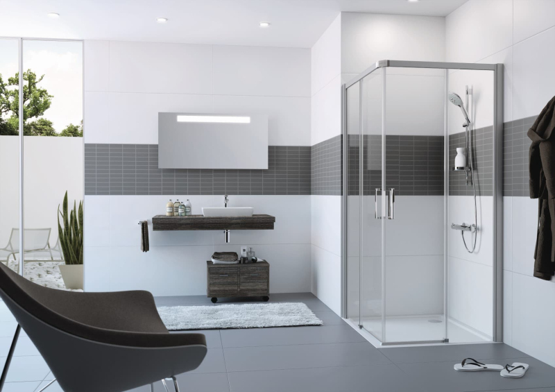 Sprchovací kút bez vaničky a farbou profilov v lesklom chróme, výplň je z číreho skla bez dekoru. Produkt je opatrený technológiou Hüppe Anti-Plaque - povrchová úprava aplikovaná vo výrobe, ktorá uľahčuje čistenie a umožňuje jednoduché stekanie vody v podobne drobných kvapiek. Posuvný systém otvárania. Určenie - ľavá aj pravá orientácia.
