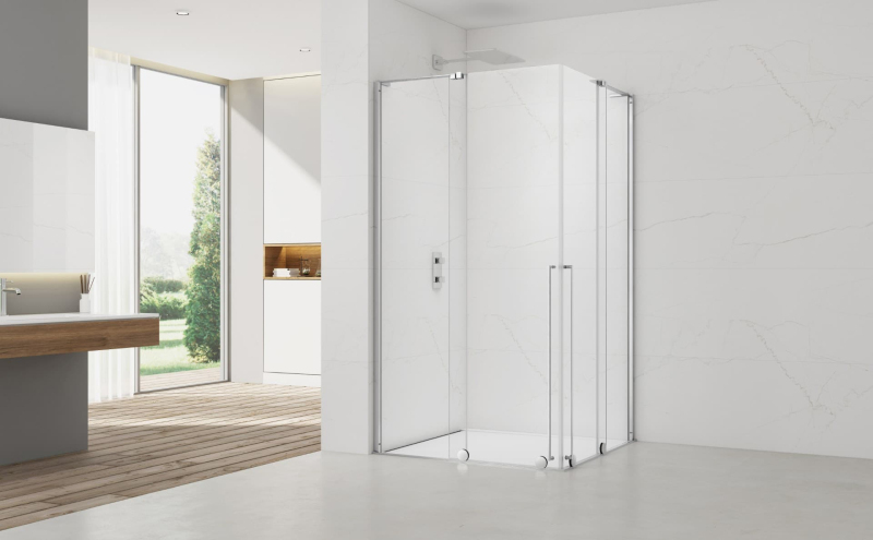 Sprchovací kút s dverami v lesklom chróme, výplň je z číreho skla bez dekoru. Produkt je opatrený povrchovou úpravou Easy Clean, ktorá uľahčuje čistenie a minimalizuje usadzovanie vodného kameňa. Posuvný systém otvárania. Určenie - ľavá aj pravá orientácia.