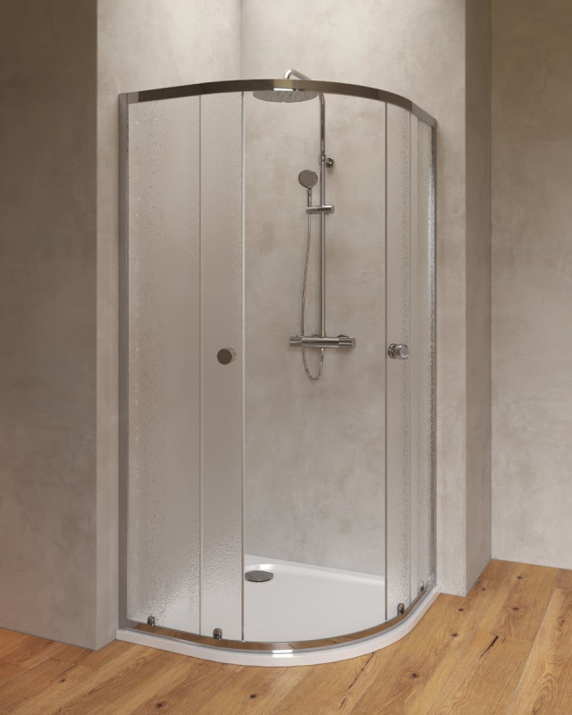 Sprchovací kút s vaničkou a farbou profilov v lesklom chróme, výplň je z nepriehľadného skla a je opatrená dekorom Chinchilla. Posuvný systém otvárania. Určenie - ľavá aj pravá orientácia.