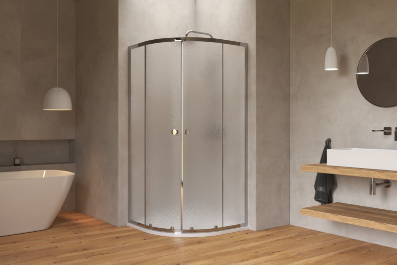 Sprchovací kút s vaničkou a farbou profilov v lesklom chróme, výplň je z nepriehľadného skla a je opatrená dekorom Chinchilla. Posuvný systém otvárania. Určenie - ľavá aj pravá orientácia.