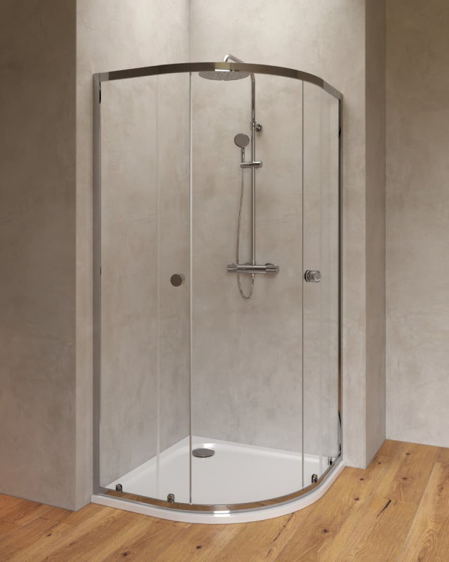 Sprchovací kút s vaničkou a farbou profilov v lesklom chróme, výplň je z číreho skla bez dekoru. Posuvný systém otvárania. Určenie - ľavá aj pravá orientácia.
