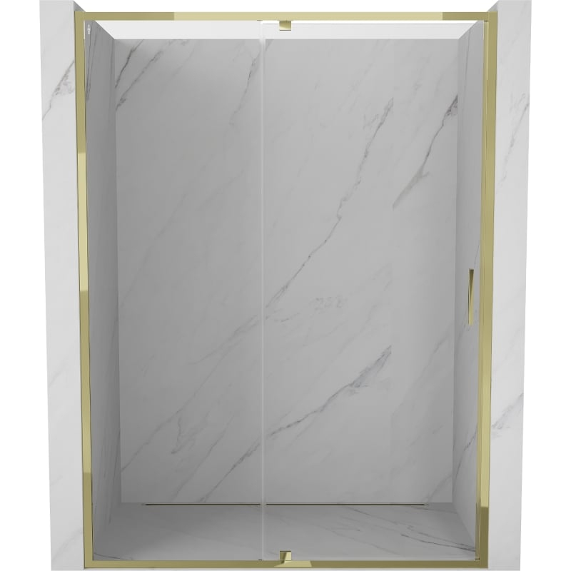 Špecifikácia produktu: Rozmer: 130x200 cm Montáž: Univerzálny Vstup: S pánty Farba skla: Priehľadná Typ skla: Tvrdené Hrúbka skla: 6 mm Profil: Hliník Povrchová úprava: Zlatý náter pre ľahké čistenie Vyrovnanie nerovností steny Nastavenie šírky Možnosť montáže na sprchovú vaničku alebo obj. Hliníkový prah na tesnenie dverí