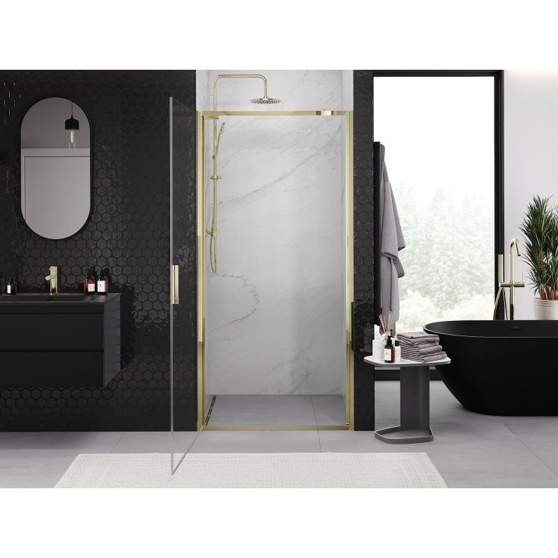 Špecifikácia produktu: Rozmer: 60x200 cm Montáž: Univerzálny Vstup: S pánty Farba skla: Priehľadná Typ skla: Tvrdené Hrúbka skla: 6 mm Profil: Hliník Povrchová úprava: Zlatý náter pre jednoduché čistenie Vyrovnanie nerovností steny Nastavenie šírky Možnosť montáže na sprchovú vaničku alebo obklady prah na tesnenie dverí