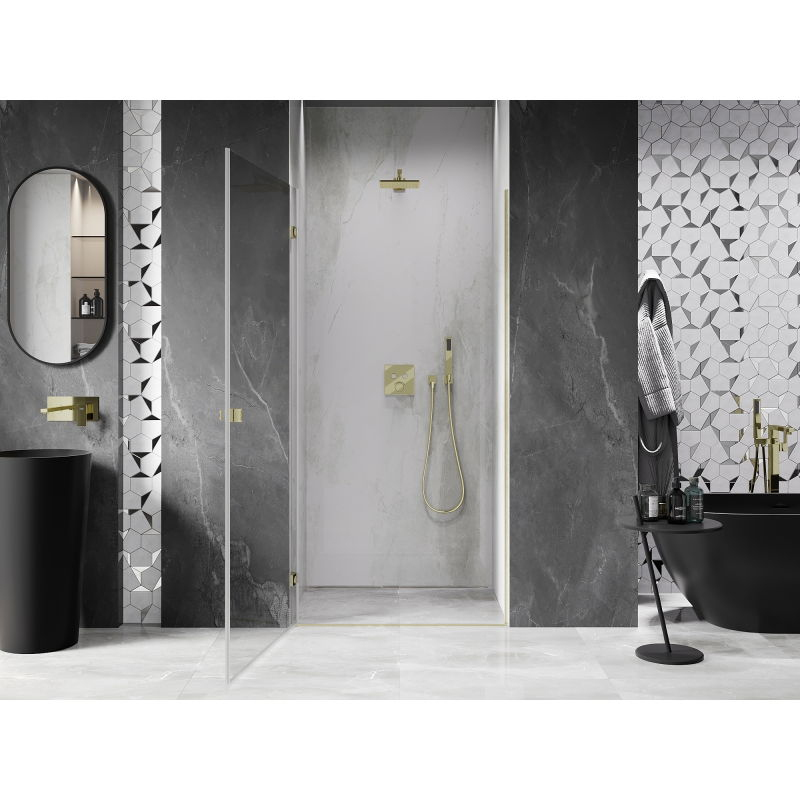 Špecifikácia produktu: Rozmer: 75x200 cm Strana montáže: Ľavá Vchod: Otváravý Farba skla: Priehľadná Povrchová úprava: Kartáčované zlato Profil: Hliník Typ skla: Tvrdené Hrúbka skla: 6 mm Povrchová úprava pre ľahké čistenie Možnosť nastavenia šírky Dva montážne systémy: - S profilom, ktorý umožňuje na sprchovú vaničku alebo obklady Mechanizmus na zdvíhanie a spúšťanie dverí Mosadzné svorky v jednej rovine so sklenenou tabuľou Magnetický prúžok a elastomérové tesnenie na odtok vody Hliníkový prah tesnenia dverí