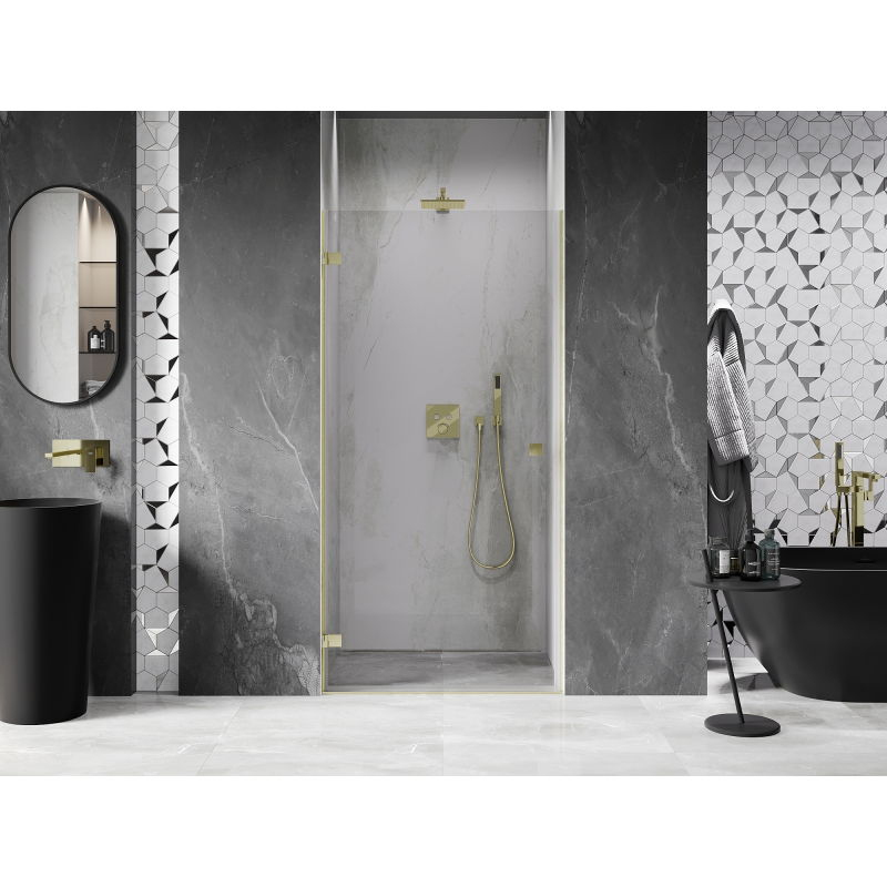 Specifikace produktu: Rozměr: 55x200 cm Strana montáže: Levá Vchod: Otevíravý Barva skla: Průhledná Povrchová úprava: Kartáčované zlato Profil: Hliník Typ skla: Tvrzené Tloušťka skla: 6 mm Povrchová úprava pro snadné čištění Možnost nastavení šířky Dva montážní systémy: - S profilem, který umožňuje vyrovnání nerovností stěn - Bez profilu pro dokonale rovné stěny Možnost montáže na sprchovou vaničku nebo obklady Mechanismus pro zvedání a spouštění dveří Mosazné svorky v jedné rovině se skleněnou tabulí Magnetický proužek a elastomerové těsnění pro odvod vody Hliníkový práh těsnění dveří