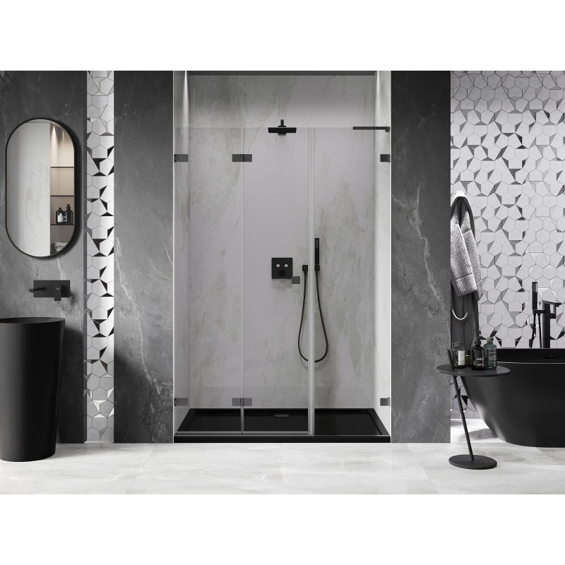 Špecifikácia produktu: Rozmer: 135x200 cm Strana montáže: Ľavá Vchod: Skladacia Farba skla: Priehľadná Povrchová úprava: Tesnená Profil: Hliník Stabilizátor v tvare L: Nerezová oceľ Typ skla: Tvrdené Hrúbka skla: dvere 6 mm, stena 8 mm Povlak pre ľahké vyrovnanie nerovností stien - Bez profilu v prípade dokonale rovných stien Možnosť montáže na sprchovú vaničku alebo obklady Mosadzné svorky a pánty v jednej rovine so sklenenou tabuľou Magnetický prúžok a elastomérové tesnenie pre odvod vody Hliníkový prah tesnenia dverí