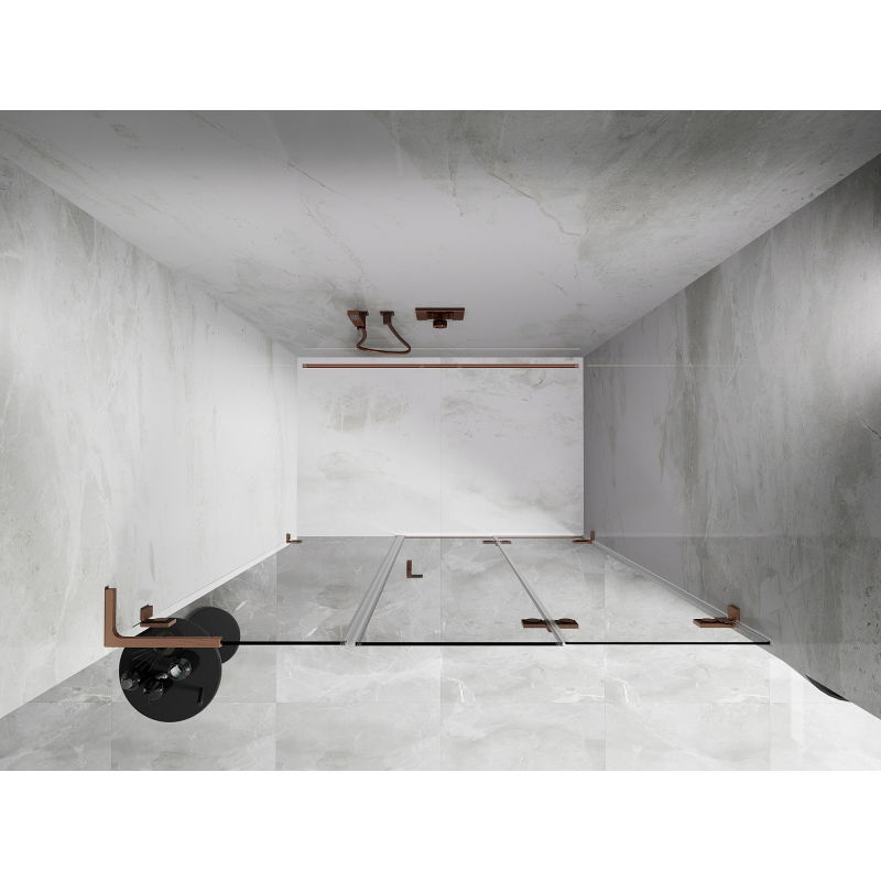Špecifikácia produktu: Rozmer: 135x200 cm Strana montáže: Pravá Vchod: Skladacia Farba skla: Priehľadná Povrchová úprava: Kartáčovaná meď Profil: Hliník Stabilizátor v tvare L: Nerezová oceľ Typ skla: Tvrdené Hrúbka skla: dvere 6 mm, stena 8 mm Povlak pre ľahké vyrovnanie nerovností stien - Bez profilu v prípade dokonale rovných stien Možnosť montáže na sprchovú vaničku alebo obklady Mosadzné svorky a pánty v jednej rovine so sklenenou tabuľou Magnetický prúžok a elastomérové tesnenie pre odvod vody Hliníkový prah tesnenia dverí