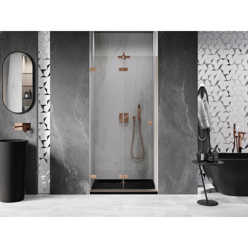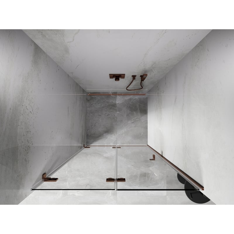 Specifikace produktu: Rozměr: 55x200 cm Strana montáže: Levá Vchod: Skládací Barva skla: Průhledná Povrchová úprava: Kartáčovaná měď Profil: Hliník Typ skla: Tvrzené Tloušťka skla: 6 mm Povrchová úprava pro snadné čištění Možnost nastavení šířky Dva montážní systémy: - S profilem, který umožňuje vyrovnání nerovností stěn - Bez profilu pro dokonale rovné stěny Možnost montáže na sprchovou vaničku nebo obklady Mosazné svorky a panty v jedné rovině se skleněnou tabulí Magnetický proužek a elastomerové těsnění pro odvod vody Hliníkový práh těsnění dveří