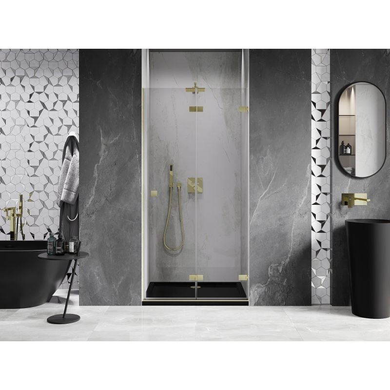 Špecifikácia produktu: Rozmer: 80x200 cm Strana montáže: Pravá Vchod: Skladacia Farba skla: Priehľadná Povrchová úprava: Kartáčované zlato Profil: Hliník Typ skla: Tvrdené Hrúbka skla: 6 mm Povrchová úprava pre ľahké čistenie Možnosť nastavenia šírky Dva montážne systémy: - S profilom, ktorý umožňuje vy sprchovú vaničku alebo obklady Mosadzné svorky a pánty v jednej rovine so sklenenou tabuľou Magnetický prúžok a elastomérové tesnenie na odvod vody Hliníkový prah tesnenia dverí