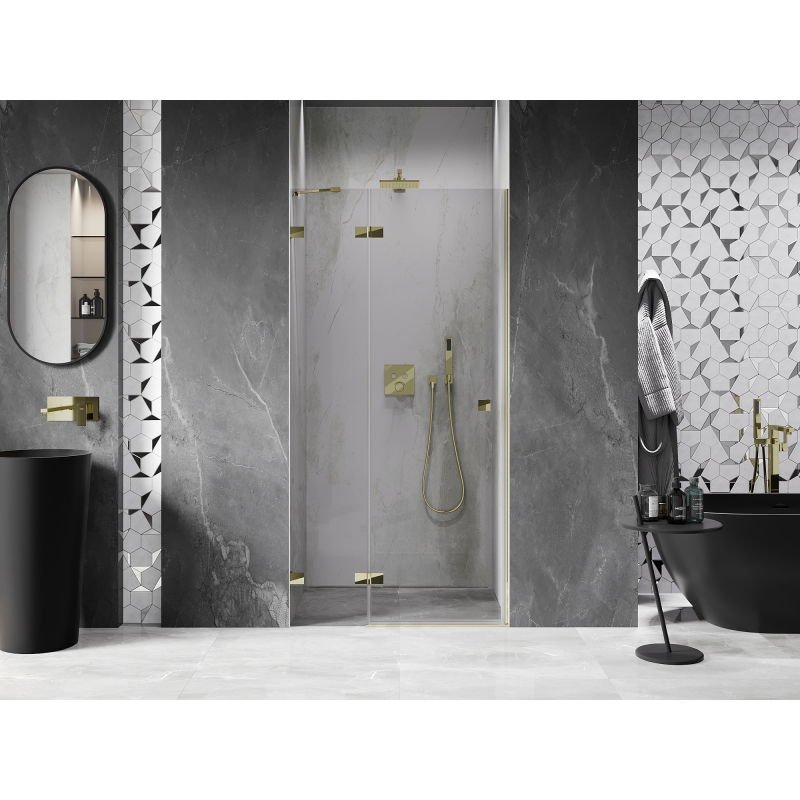 Špecifikácia produktu: Rozmer: 85x200 cm Strana montáže: Ľavá Vchod: Otváravý Farba skla: Priehľadná Povrchová úprava: Zlatá Profil: Hliník Konzola: Nerezová oceľ Typ skla: Tvrdené Hrúbka skla: 8 mm Povrchová úprava pre ľahké čistenie Možnosť nastavenia šírky Dva montážne systémy: rovné steny Možnosť montáže na sprchovú vaničku alebo obklady Mechanizmus na zdvíhanie a spúšťanie dverí Mosadzné svorky a pánty v jednej rovine so sklenenou tabuľou Magnetický prúžok a elastomérové tesnenie na odvod vody Hliníkový prah tesnenia dverí