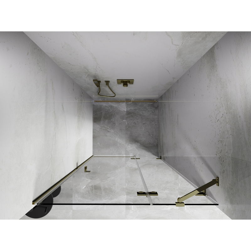 Špecifikácia produktu: Rozmer: 115x200 cm Strana montáže: Pravá Vchod: Otváravý Farba skla: Priehľadná Povrchová úprava: Zlatá Profil: Hliník Konzola: Nerezová oceľ Typ skla: Tvrdené Hrúbka skla: 8 mm Povrchová úprava pre jednoduché čistenie Nastaviteľná šírka Dva montáž dokonale rovné steny Možnosť montáže na sprchovú vaničku alebo obklady Mechanizmus na zdvíhanie a spúšťanie dverí Mosadzné svorky a pánty v jednej rovine so sklenenou tabuľou Magnetický prúžok a elastomérové tesnenie na odvod vody Hliníkový prah tesnenia dverí