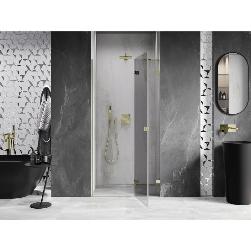 Špecifikácia produktu: Rozmer: 120x200 cm Strana montáže: Pravá Vchod: Otváravý Farba skla: Priehľadná Povrchová úprava: Zlatá Profil: Hliník Konzola: Nerezová oceľ Typ skla: Tvrdené Hrúbka skla: 8 mm Povrchová úprava pre jednoduché čistenie Nastaviteľná šírka Dva montáž dokonale rovné steny Možnosť montáže na sprchovú vaničku alebo obklady Mechanizmus na zdvíhanie a spúšťanie dverí Mosadzné svorky a pánty v jednej rovine so sklenenou tabuľou Magnetický prúžok a elastomérové tesnenie na odvod vody Hliníkový prah tesnenia dverí