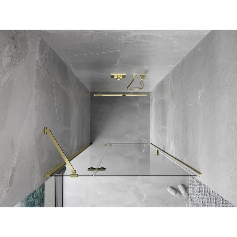 Špecifikácia produktu: Rozmer: 105x200 cm Strana montáže: Ľavá Vchod: Otváravý Farba skla: Priehľadná Povrchová úprava: Zlatá Profil: Hliník Konzola: Nerezová oceľ Typ skla: Tvrdené Hrúbka skla: 6 mm Povrchová úprava pre ľahké čistenie Nastaviteľná šírka Možnosť inštalácie spúšťanie dverí Mosadzné pánty v jednej rovine so sklom Magnetický prúžok a elastomérové tesnenie pre odtok vody Hliníkový prah tesnenia dverí