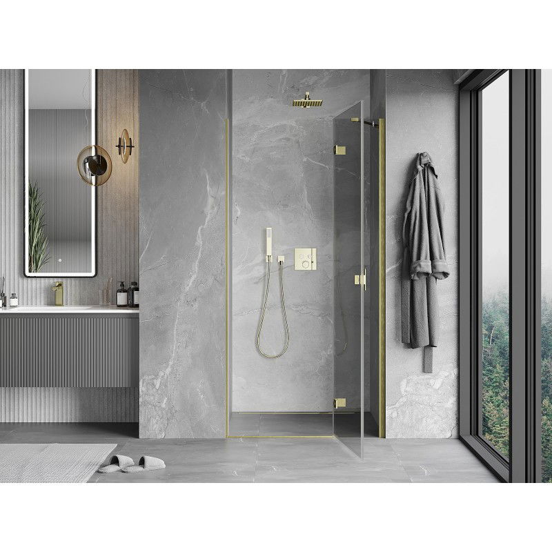 Špecifikácia produktu: Rozmer: 75x200 cm Strana montáže: Pravá Vchod: Otváravý Farba skla: Priehľadná Povrchová úprava: Kartáčované zlato Profil: Hliník Nosná konštrukcia: Nerezová oceľ Typ skla: Tvrdené Hrúbka skla: 6 mm Povrchová úprava pre ľahké čistenie Nastaviteľná šírka Možnosť inštalácie zdvíhanie a spúšťanie dverí Mosadzné pánty v jednej rovine so sklom Magnetický prúžok a elastomérové tesnenie pre odtok vody Hliníkový prah tesnenia dverí