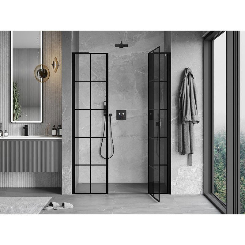 Špecifikácia produktu: Rozmer: 145x200 cm Strana montáže: Pravá Vchod: Otváravý Farba skla: Čierna mriežka Povrchová úprava: Čierna Profil: Hliník Uhlový stabilizátor L: Nerezová oceľ Typ skla: Tvrdené Hrúbka skla: 6 mm Povrchová úprava pre ľahké čistenie Nastaviteľ Mechanizmus na zdvíhanie a spúšťanie dverí Magnetický prúžok a elastomérové tesnenie na odtok vody Hliníkový prah tesnenia dverí