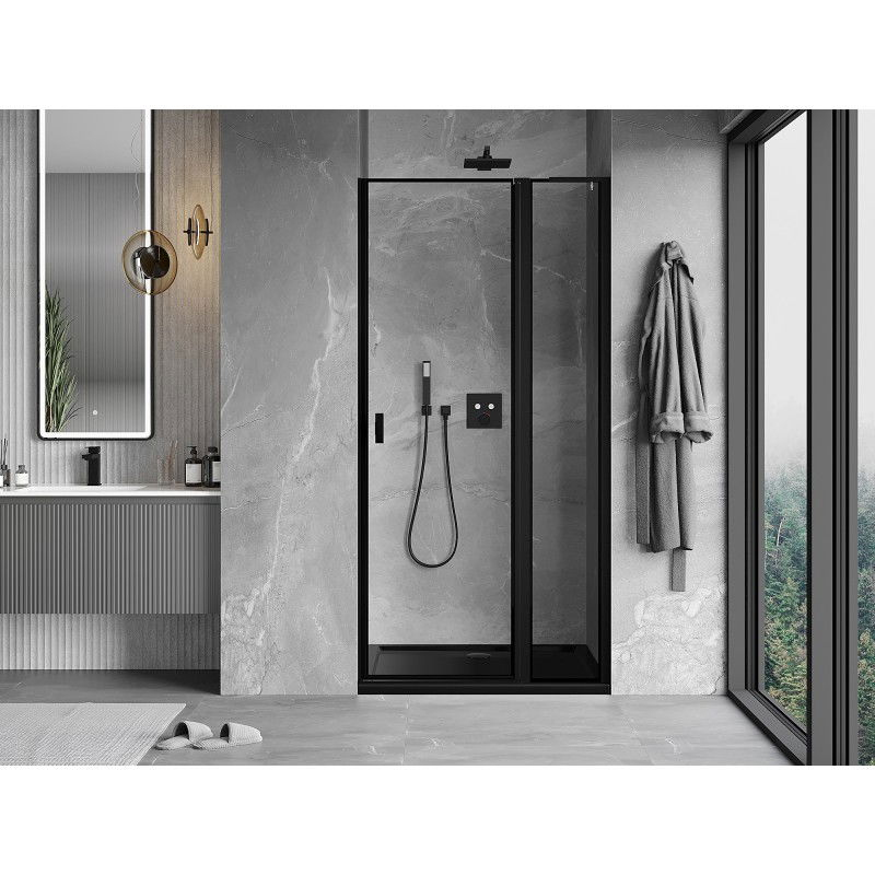 Špecifikácia produktu: Rozmer: 95x200 cm Strana montáže: Pravá Vchod: Výklopný Farba skla: Čierny rám Povrchová úprava: Čierna Profil: Hliník Uhlový stabilizátor L: Nerezová oceľ Typ skla: Tvrdené Hrúbka skla: 6 mm Povrchová úprava pre ľahké čistenie Nastaviteľná šírka Možnosť inštalácie a spúšťanie dverí Magnetický prúžok a elastomérové tesnenie pre odtok vody Hliníkový prah tesnenia dverí