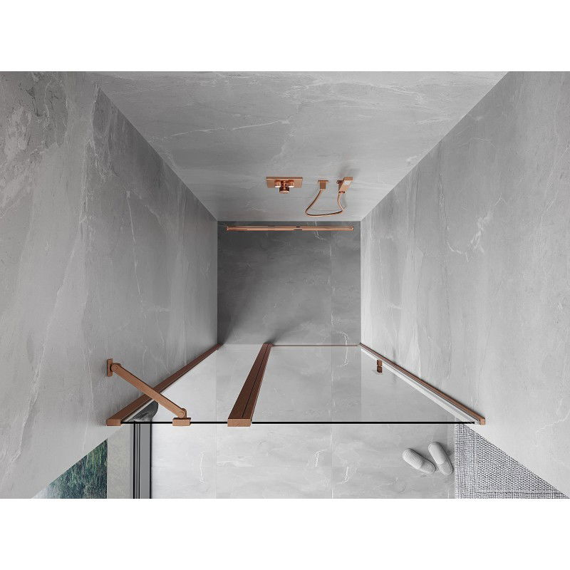 Špecifikácia produktu: Rozmer: 80x200 cm Strana montáže: Univerzálny Vchod: Výklopný Farba skla: Priehľadná Povrchová úprava: Kartáčovaná meď Profil: Hliník Konzola: Nerezová oceľ Typ skla: Tvrdené Hrúbka skla: 6 mm Povrchová úprava pre ľahké čistenie Nastaviteľná šírka Možnosť inštalácie zdvíhanie a spúšťanie dverí Magnetický prúžok a elastomérové tesnenie pre odtok vody Hliníkový prah tesnenia dverí