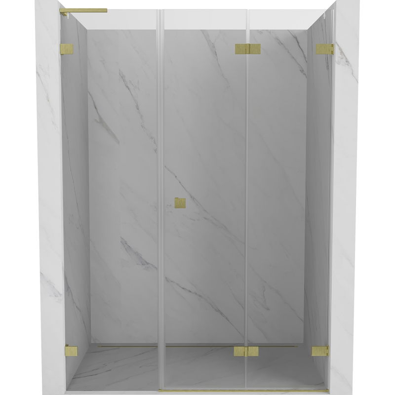 Špecifikácia produktu: Rozmer: 115x200 cm Strana montáže: Pravá Vchod: Skladacia Farba skla: Priehľadná Povrchová úprava: Kartáčované zlato Profil: Hliník Uhlový stabilizátor L: Nerezová oceľ Typ skla: Tvrdené Hrúbka skla: dvere 6 mm, stena 8 mm Povlak pre ľahké čistenie nerovností stien - Bez profilu v prípade dokonale rovných stien Možnosť montáže na sprchovú vaničku alebo obklady Mosadzné svorky a pánty v jednej rovine so sklenenou tabuľou Magnetický prúžok a elastomérové tesnenie pre odvod vody Hliníkový prah tesnenia dverí