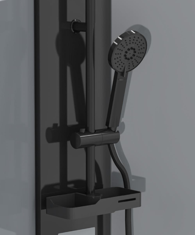 Sprchový box s vaničkou a farbou profilov v čiernej farbe, výplň je z číreho skla bez dekoru. Posuvný systém otvárania. Určenie - ľavá aj pravá orientácia.