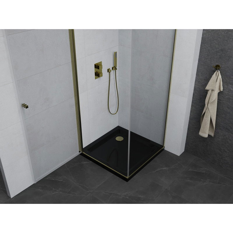 Sprchový kout Mexen Pretoria s výklopným mechanismem 90 x 90 cm, průhledný, zlatý + plochá sprchová vanička, černá - 852-090-090-50-00-4070G