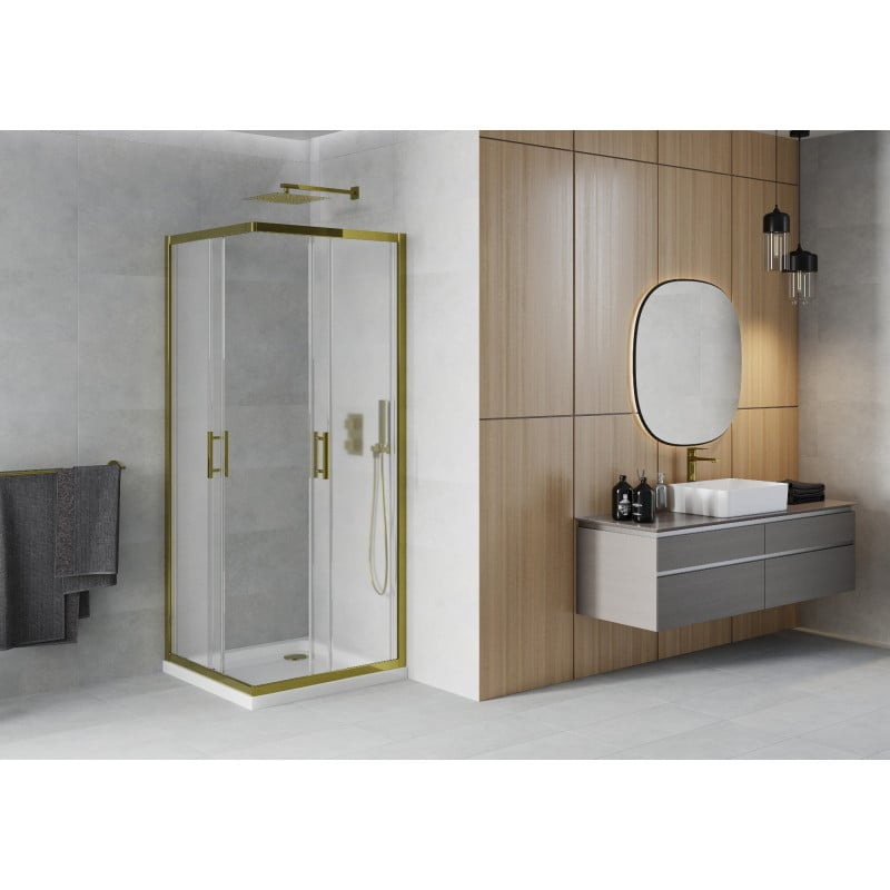 Sprchový kout Mexen Rio čtvercový 80 x 80 cm, matně zlatý + plochá sprchová vanička, bílá - 860-080-080-50-30-4010G