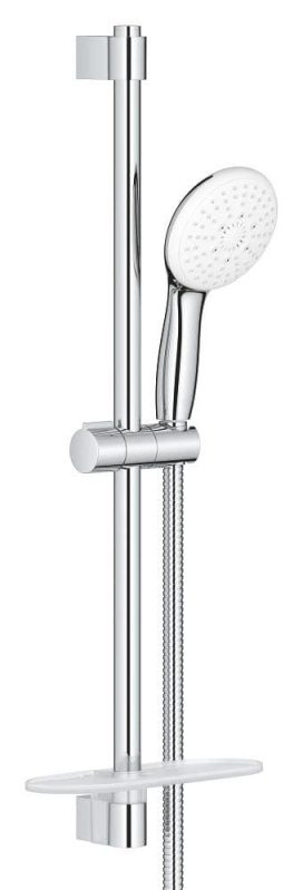 Sprchový set s 3 funkciami s poličkou. Uvedená dĺžka výrobku je 60 cm a priemer udávaný výrobcom je 11 cm. Prietok 8,4 litrov/minútu.