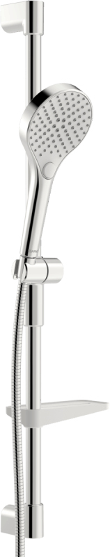 Sprchový set se 3 funkcemi s poličkou. Průměr udávaný výrobcem je 11 cm. Průtok 7,8 litrů/minutu.