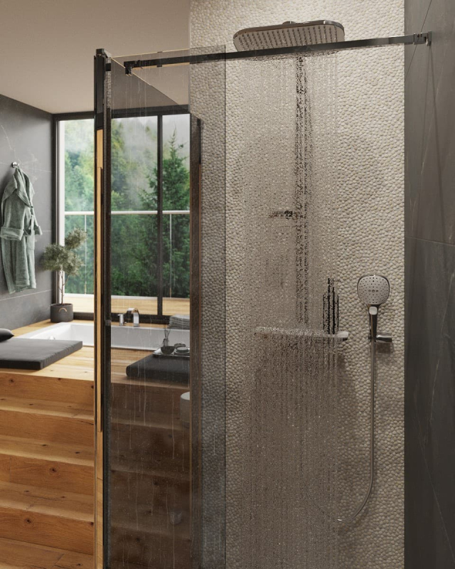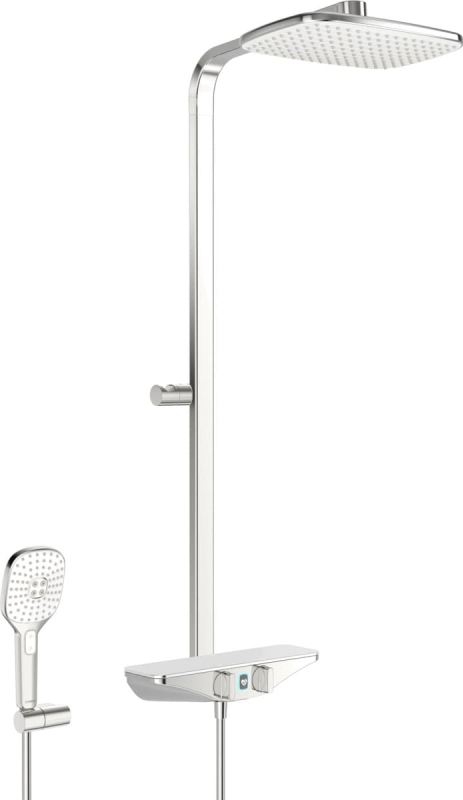 Sprchový systém s termostatickou batériou s 3 funkciami s dĺžkou 113 cm. Rozteč batérie je 150 mm. Prietok 12 litrov/minútu.