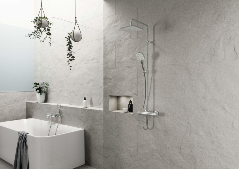 Sprchový systém s termostatickou batériou s montážou na stenu.