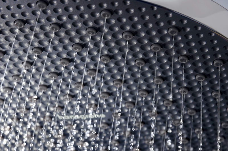 Sprchový systém s 3 funkciami, s vaňovým termostatom. Rozteč batérie je 150 mm. Prietok 8 litrov/minútu.